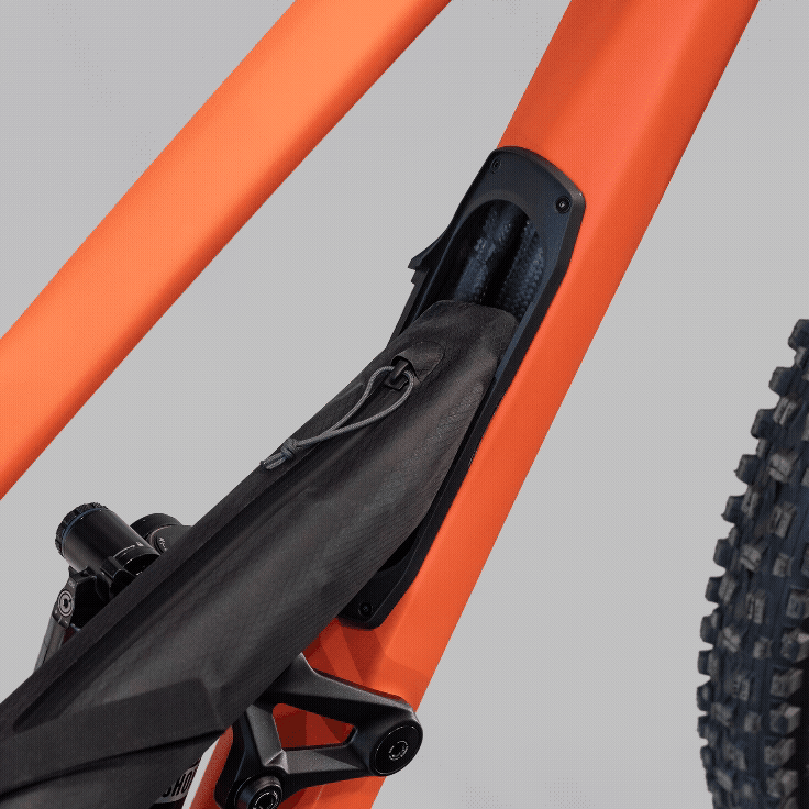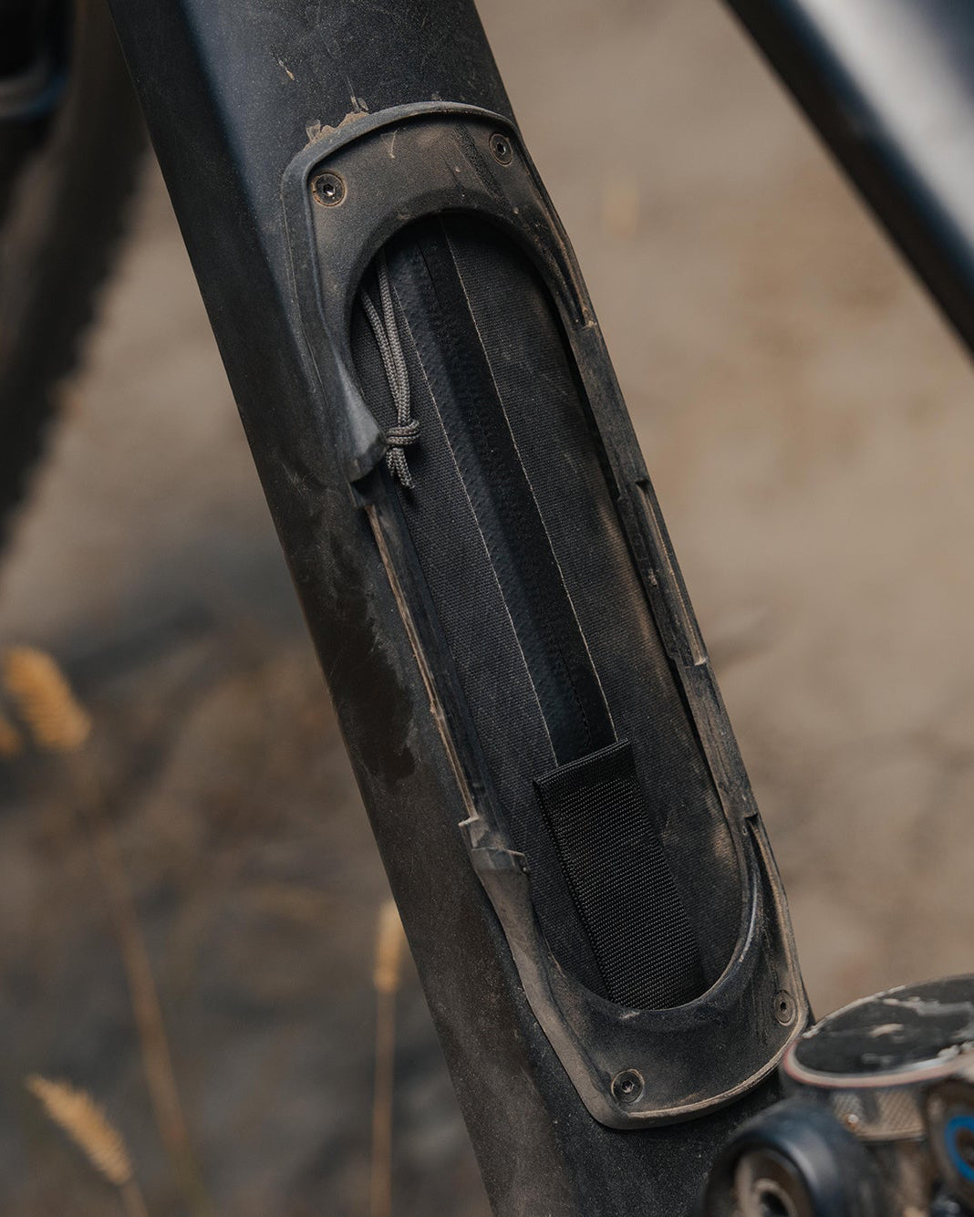 Included with all bikes equipped with The Lunchbox, the Snak-Pak provides a convenient storage option for whatever your heart desires. For quick trail-side removal, insert the zipper end of the Snak-Pak into the down tube first. This ensures easy access to the fabric loop when the Lunchbox is opened.