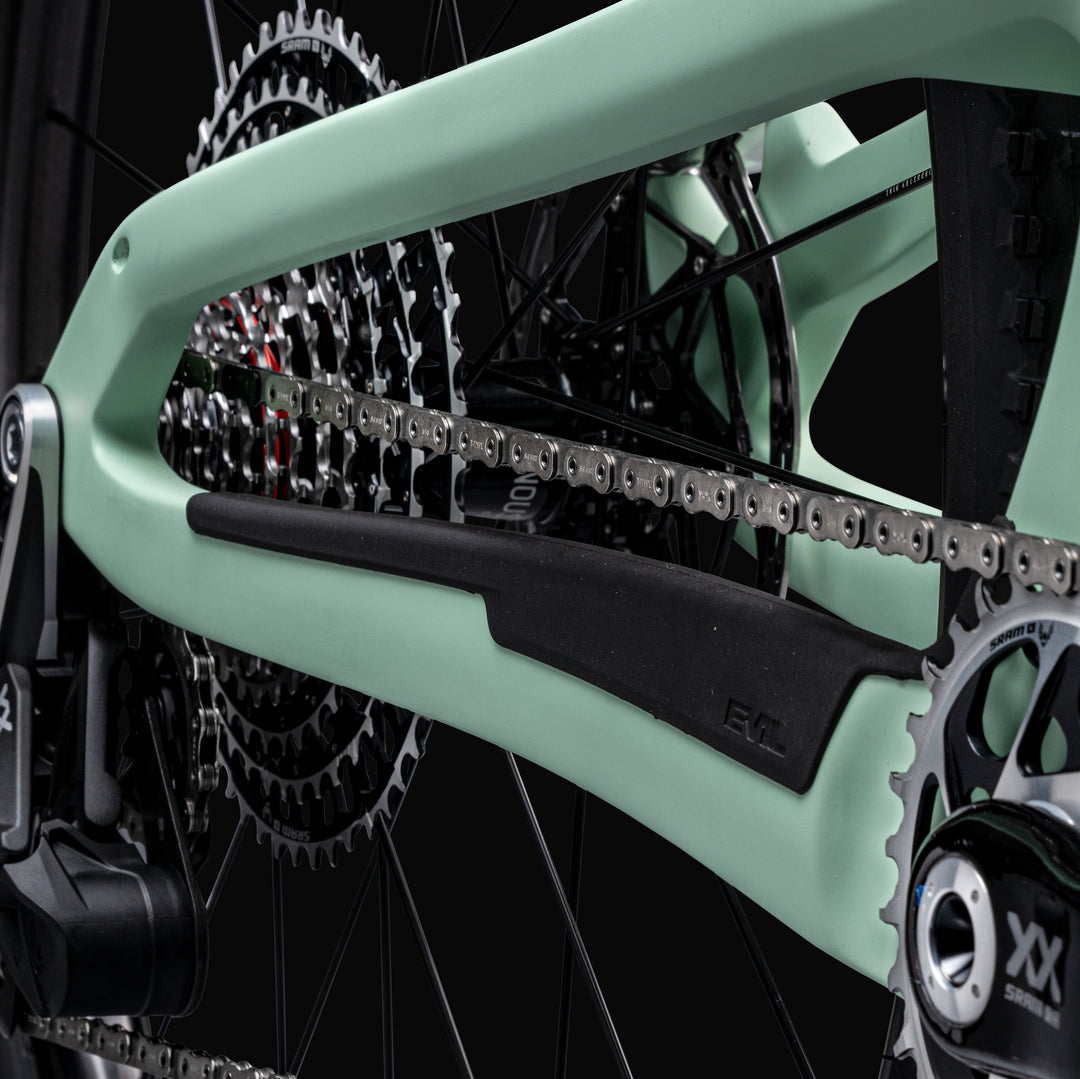 A rubber sound canceling chainstay protector keep the drivetrain silent and deadly.