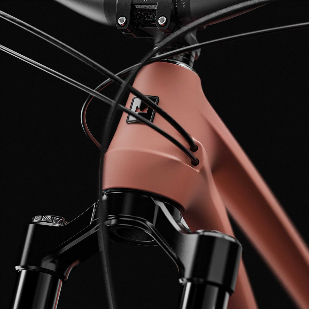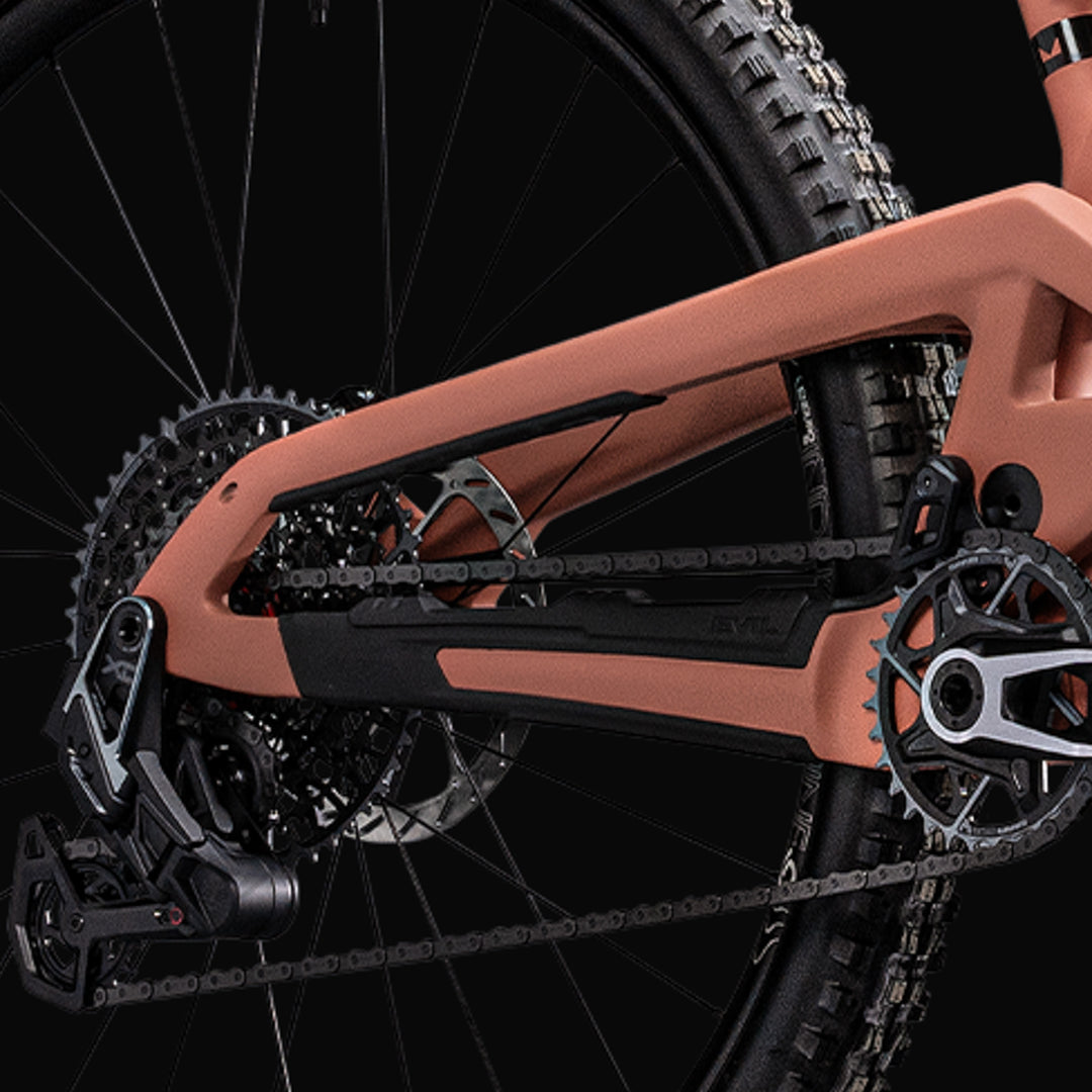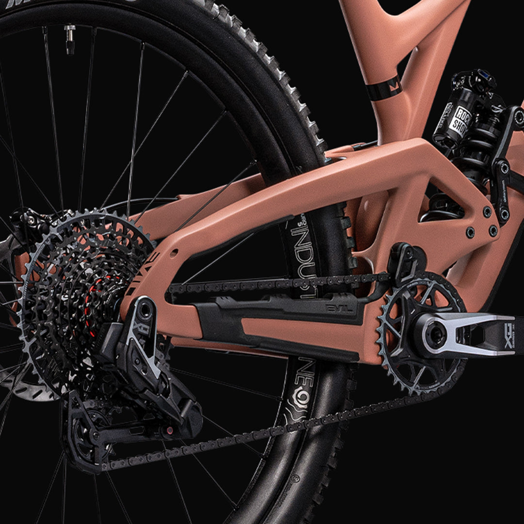 A rubber sound canceling chainstay protector and an integrated chain guide keep the drivetrain silent and deadly.